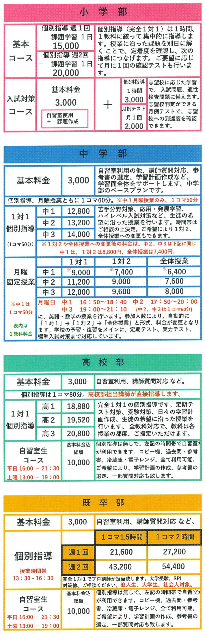 (志望校のレベルと、学校でどの程度参考書が配られているかによって、大幅に料金が変わります)